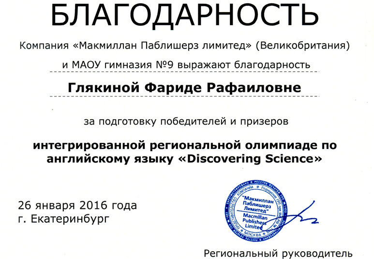 Благодарности с занесением в трудовую книжку за организацию Региональной олимпиады по английскому ( 2015, 2016 г.г.)
